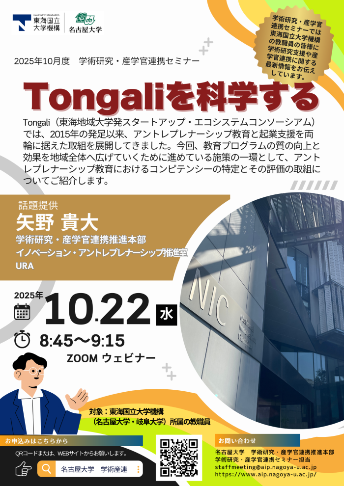 ・概 要:Tongali(東海地域大学発スタートアップ・エコシステムコンソーシアム)では、2015年の発足以来、アントレプレナーシップ教育と起業支援を両輪に据えた取組を展開してきました。今回、教育プログラムの質の向上と効果を地域全体へ広げていくために進めている施策の一環として、アントレプレナーシップ教育におけるコンピテンシーの特定とその評価の取組についてご紹介します。