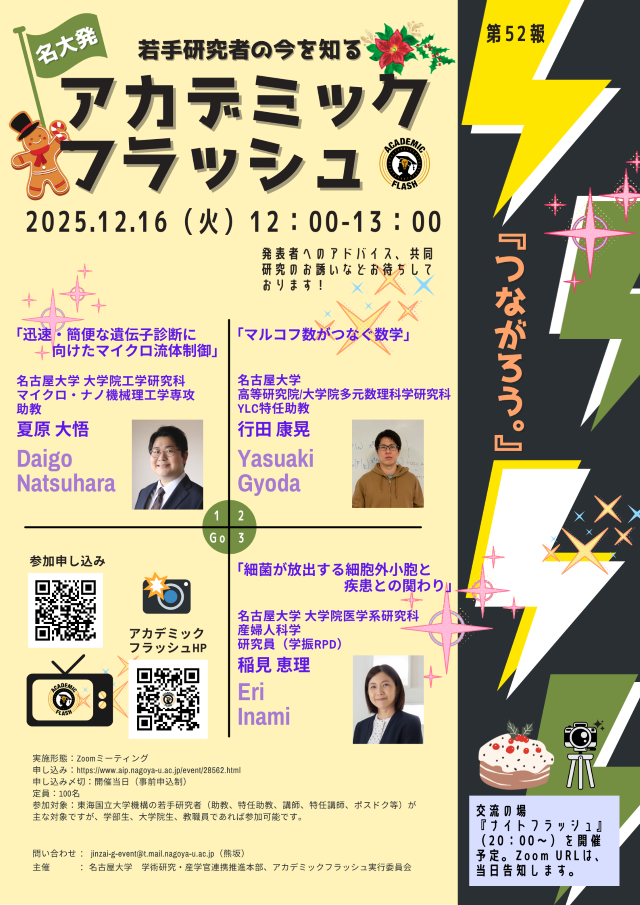 In Academic Flash, early career researchers from various fields will introduce their research in the form of flash talks. Some of the participants receive unexpected hints during the event, and lead to joint research. Participants are encouraged to make comments and ask questions to the presenters.