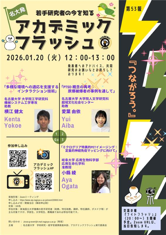 In Academic Flash, early career researchers from various fields will introduce their research in the form of flash talks. Some of the participants receive unexpected hints during the event, and lead to joint research. Participants are encouraged to make comments and ask questions to the presenters.