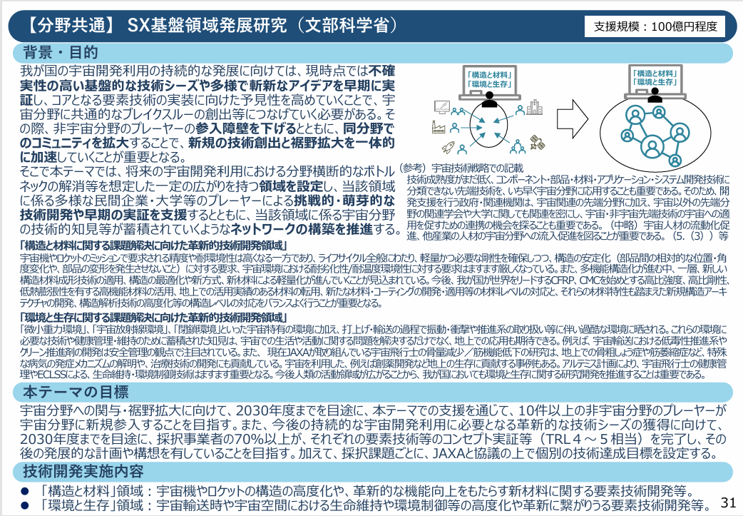将来の宇宙開発利用におけるボトルネックの解消等に向けて設定された領域(「構造と材料」及び「環境と生存」)の下、多様な民間企業・大学等のプレーヤーが参画し、当該領域に係る挑戦的・萌芽的な要素技術を開発する。