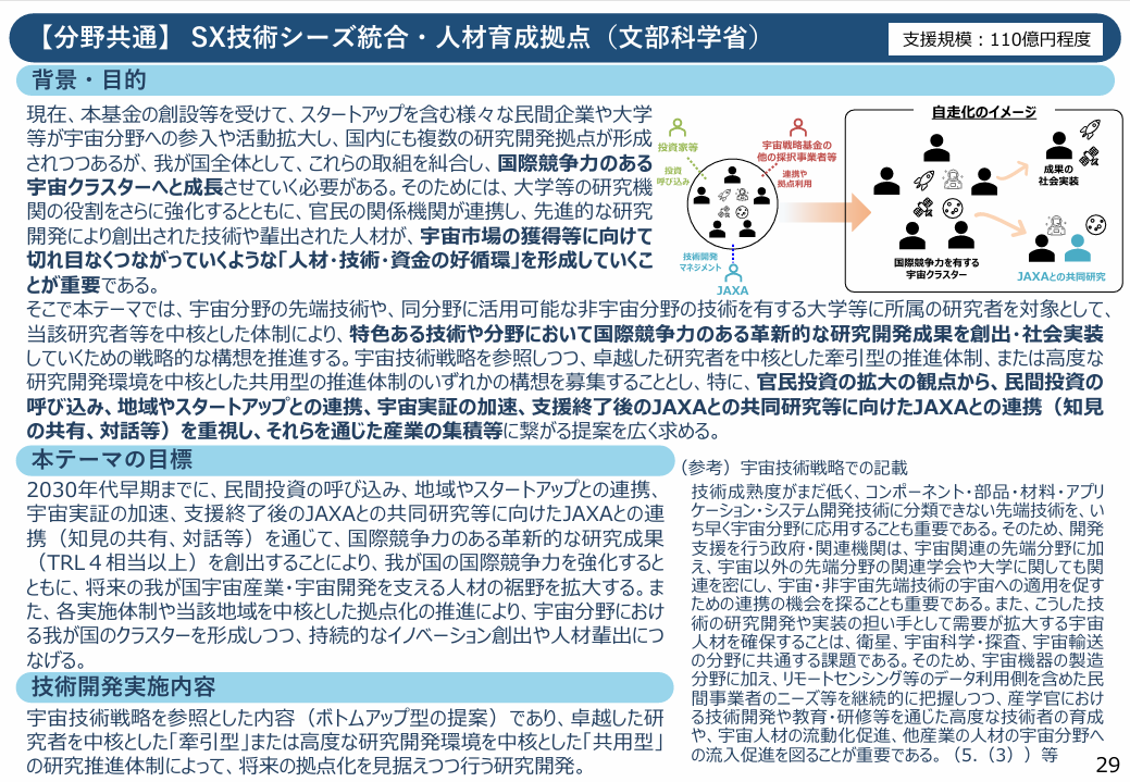 大学等の研究者を中核とした体制により、宇宙分野の継続的な発展に向けて、関連する様々なコミュニティの連携を深化させ、特色ある技術等、革新的な成果を創出するとともに、当該体制を中核とした国際競争力のある宇宙クラスターの形成を目指す。