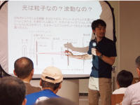 日時:2014年10月1日(水)18:30-20:00 ゲスト:谷村 省吾(名古屋大学大学院情報科学研究科教授) 会場:ジュンク堂書店ロフト名古屋店 光は波なのか、粒なのか。波だと考えれば説明がつくこともあり、粒だと考えれば説明がつくこともあり・・・。まるでトリックアートのような様相を見せる光の世界の不思議について、紹介しました。ちょっとした実験やユーモアも交えて、わかりやすく面白い、量子力学のお話でした。