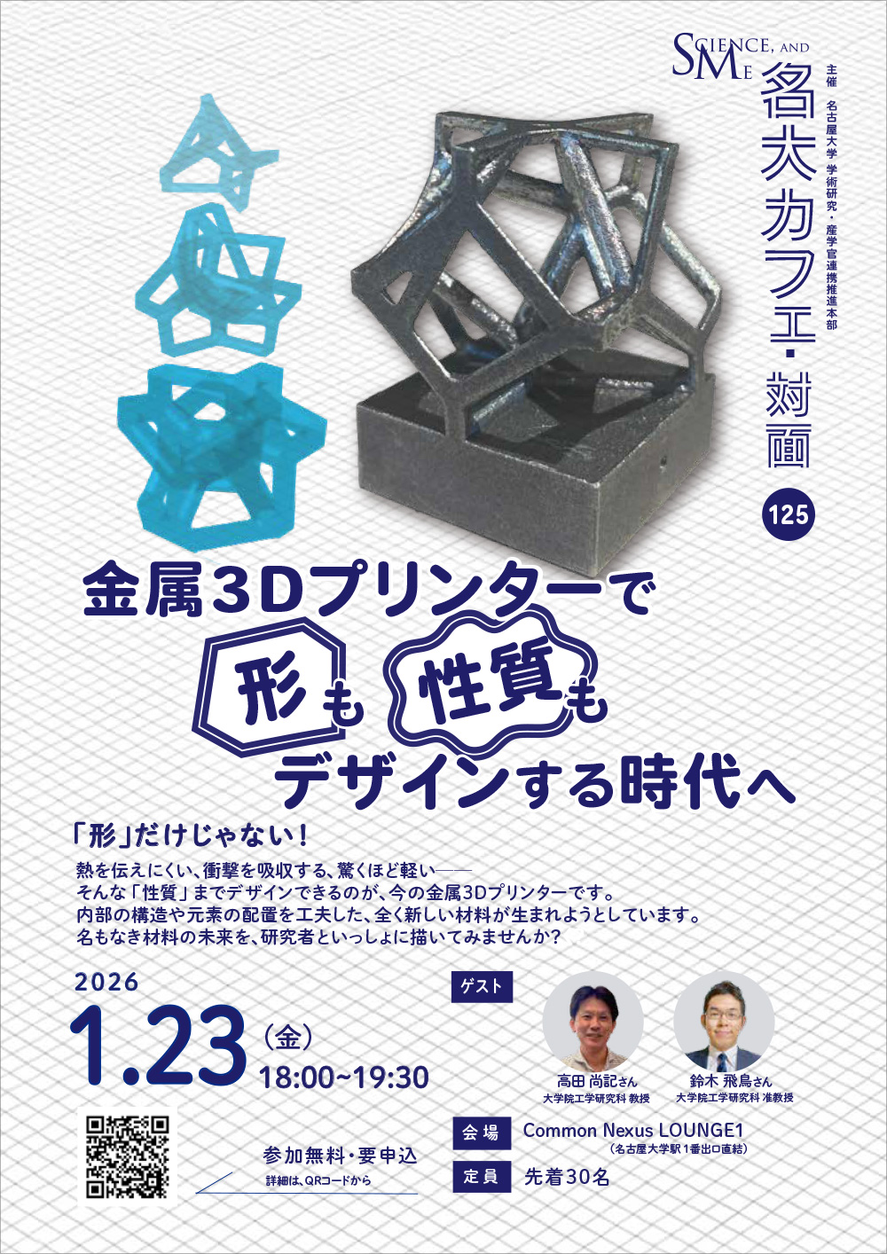 第125回 名大カフェ「金属3Dプリンターで、形も性質もデザインする時代へ」2026年1月23日開催